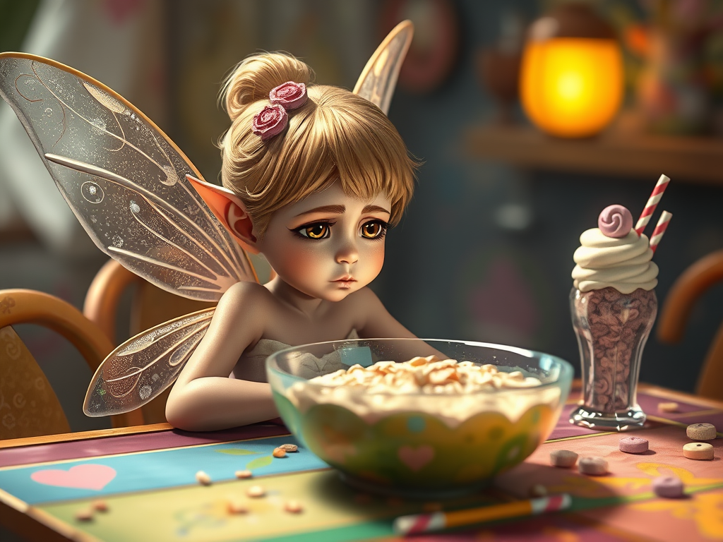 La Petite Fée était assise à table, les lèvres boudeuses.
